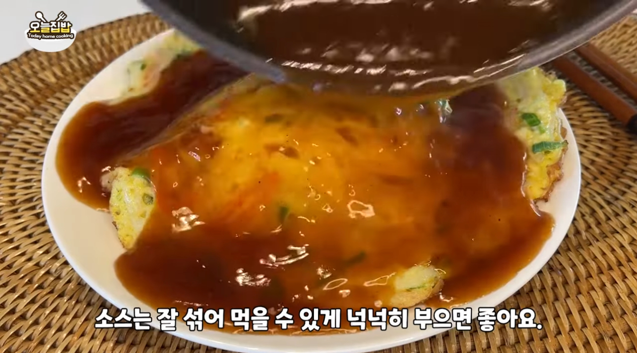 10. 계란 이불 위에 소스를 넉넉히 부어 밥과 함께 비벼 드시면 됩니다