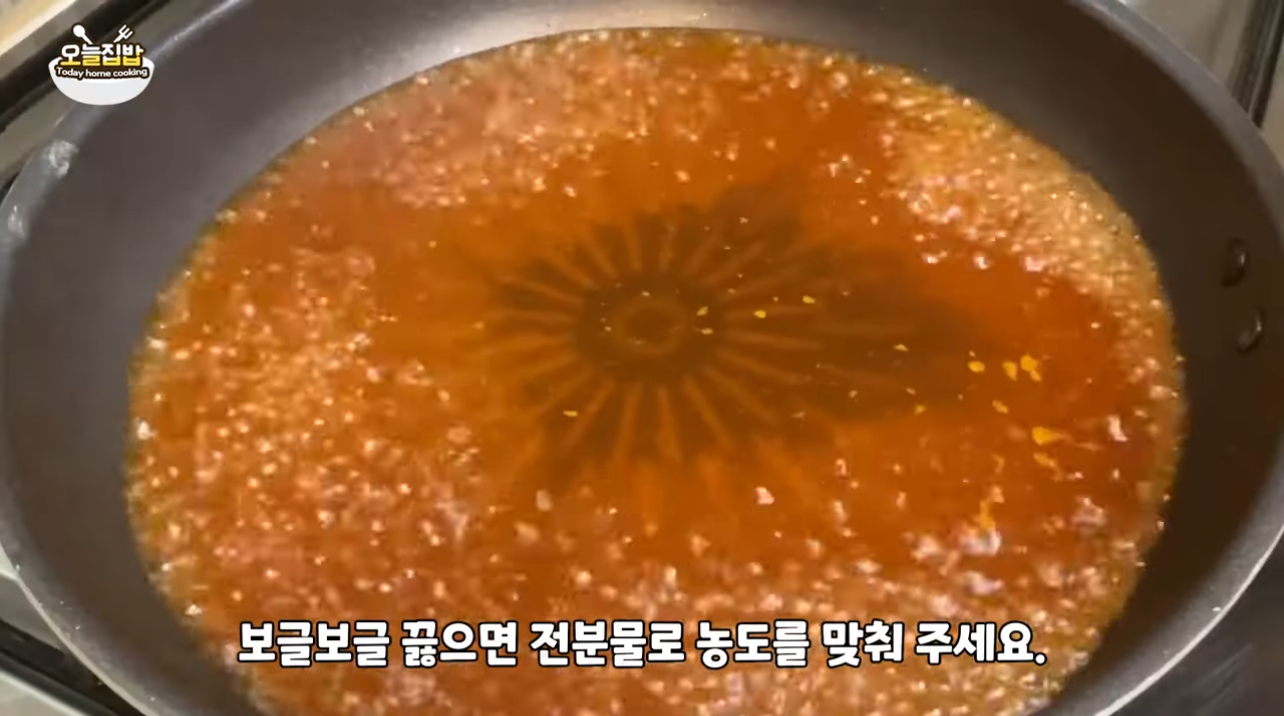 설탕과 케찹을 녹도록 빠르게 저어주다 끟으면 전분물(전분가루 1: 물 1) 한 숟가락씩 넣어가며 농도를 맞춰 걸죽하게 만들어요