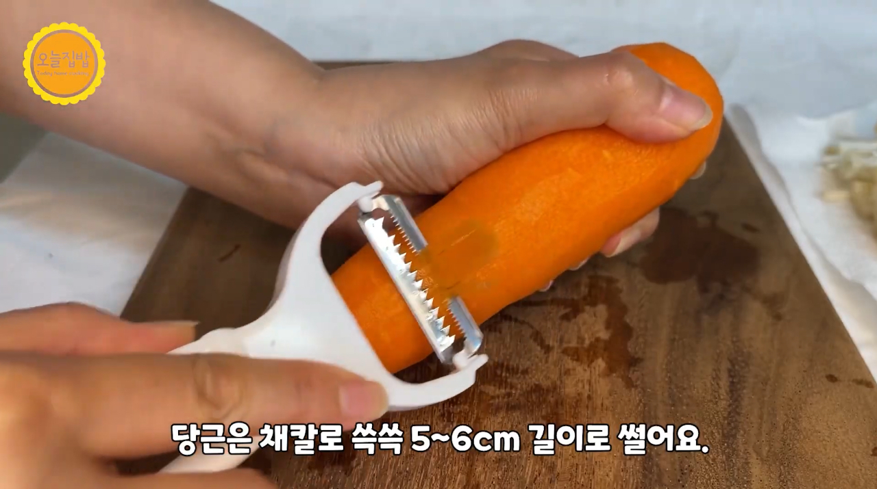 3. 당근도 쉽게 채칼로 쓱쓱 5~6cm 길이로 채썰어 준비합니다