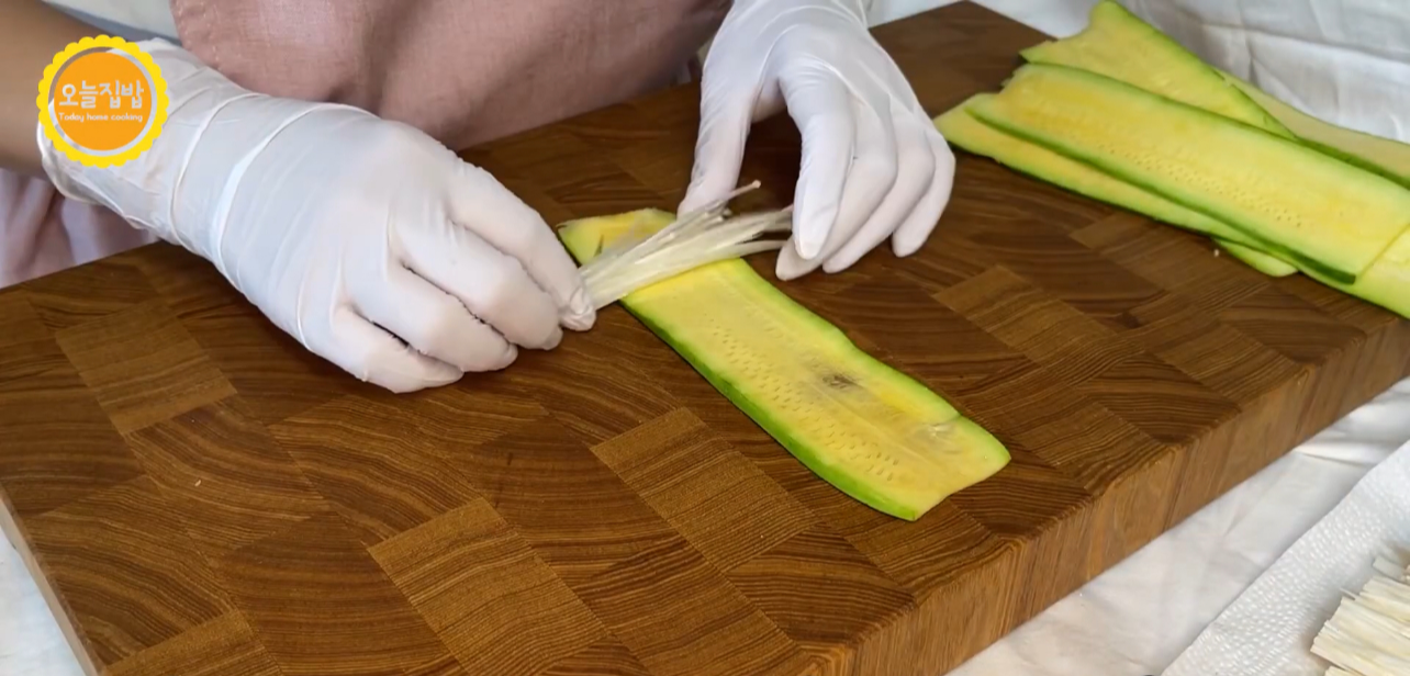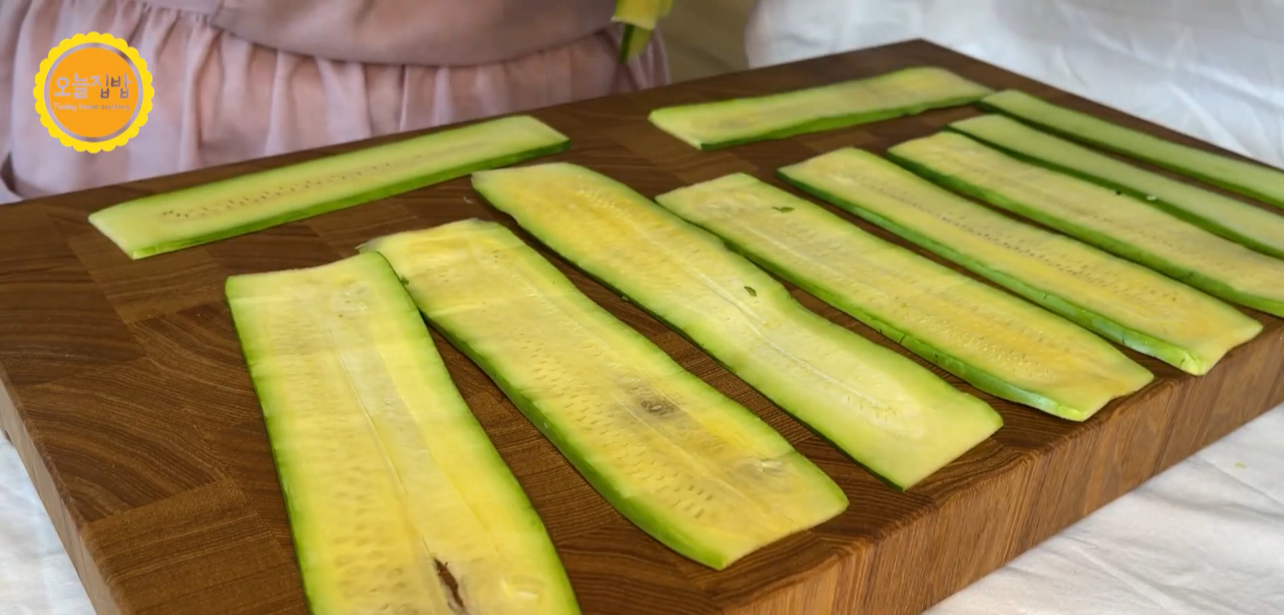 7. 소금간이 밴 호박을 도마위에 올려놓고 키친타월로 살짝 눌러 물기를 흡수 시킨 후