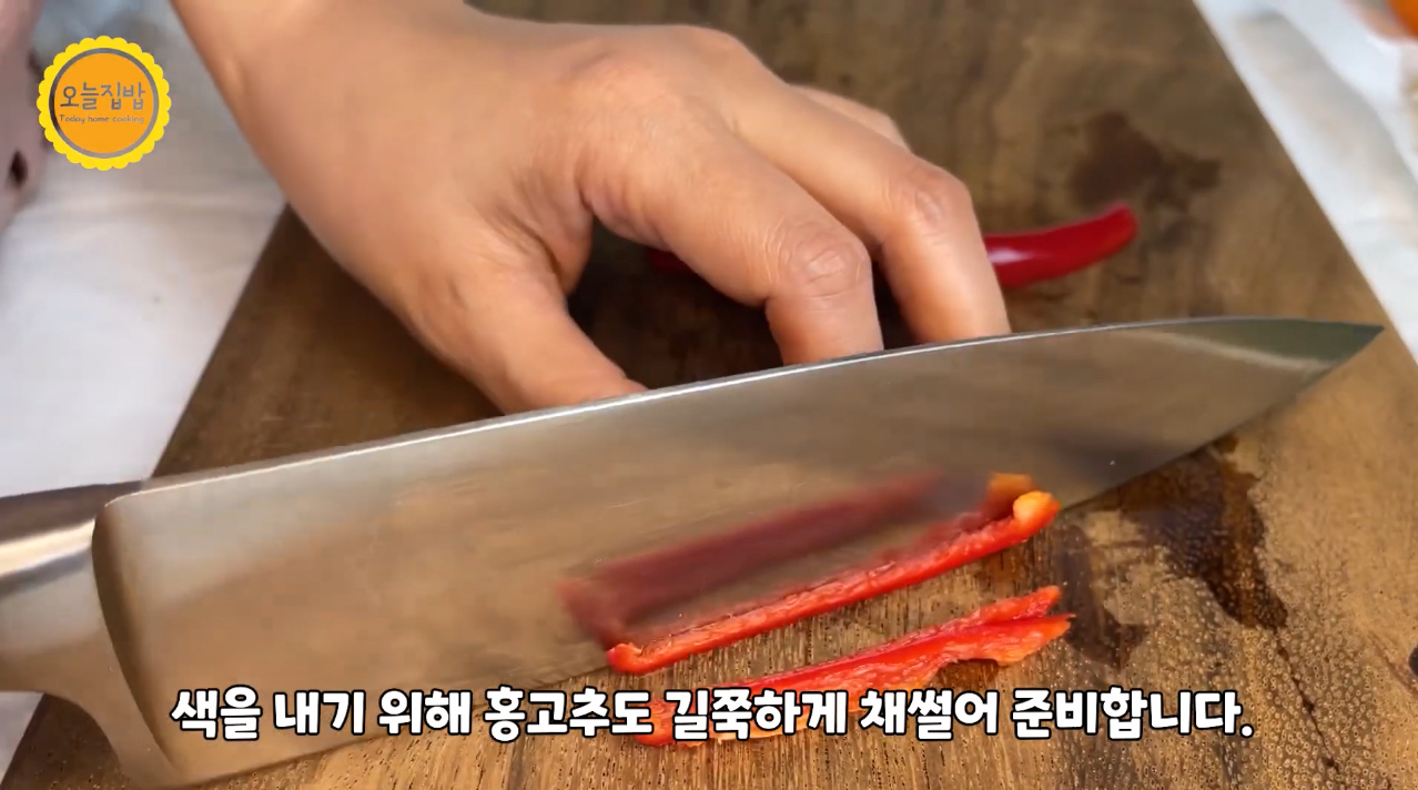5. 홍고추도 색을 내기 위해 길쭉하게 채썰어 준비합니다