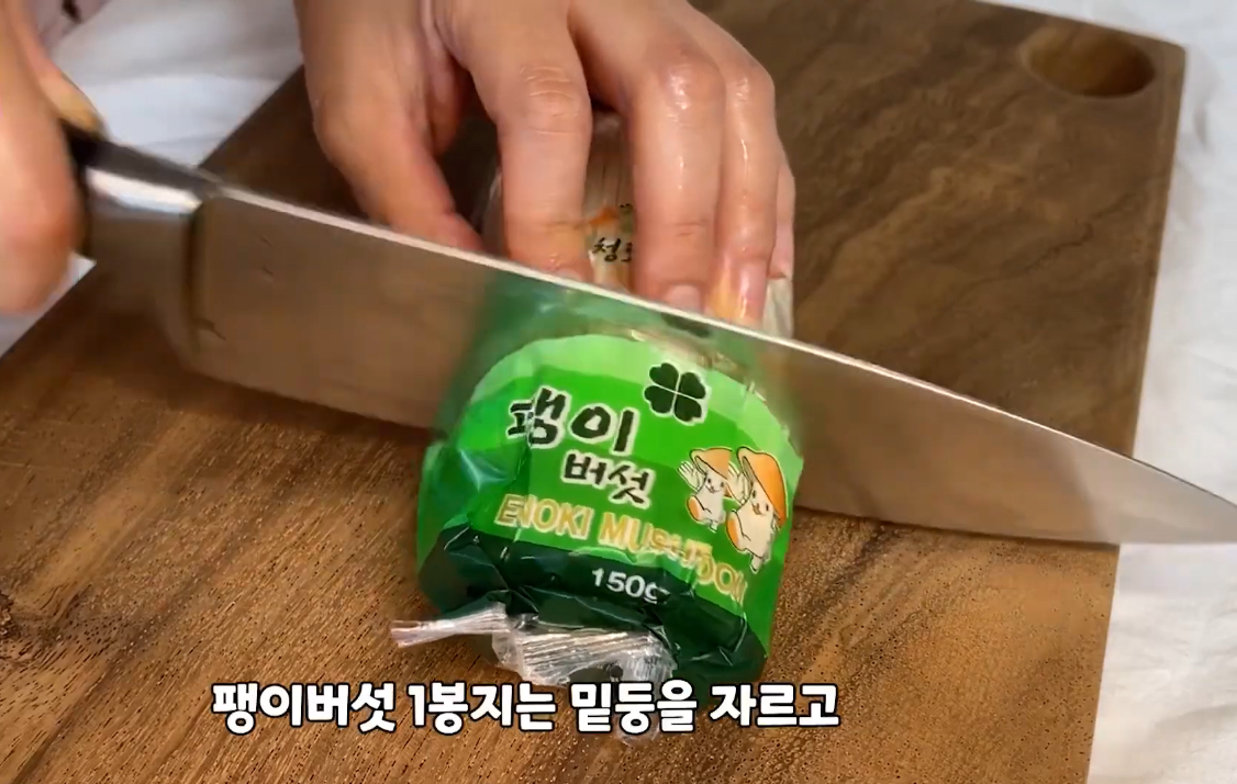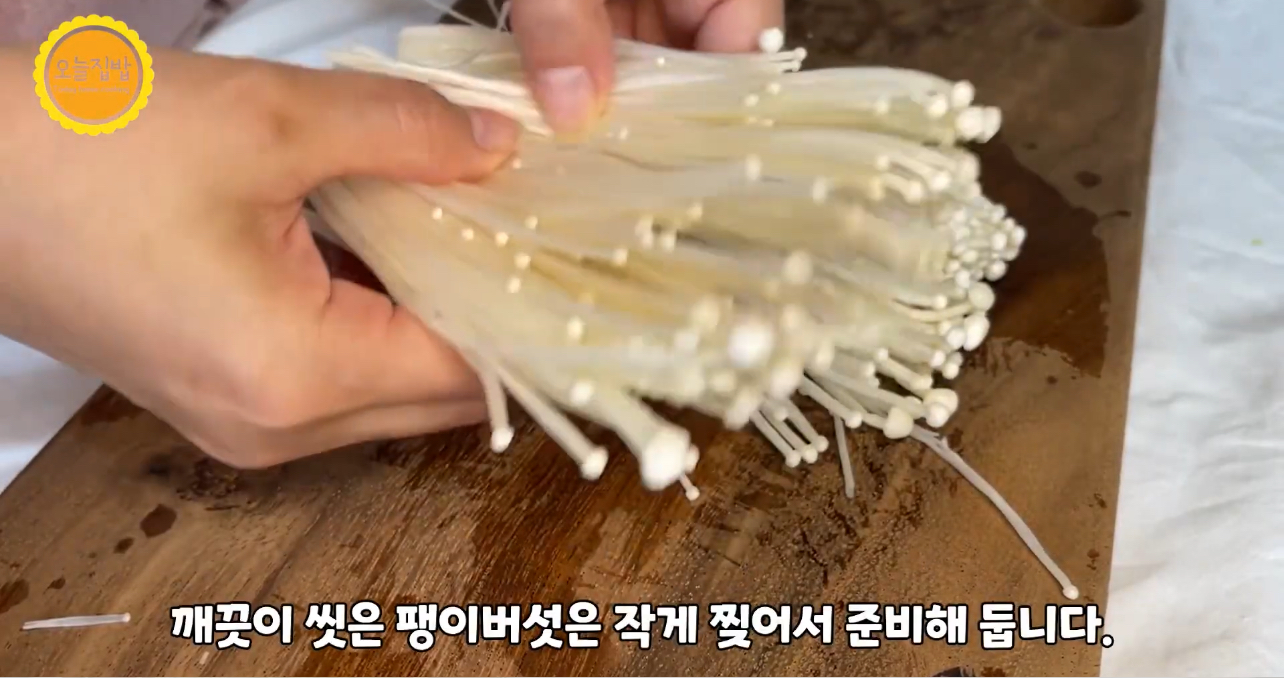 2. 팽이버섯 1봉지는 밑둥을 자르고 가볍게 흔들어 씻어 주세요