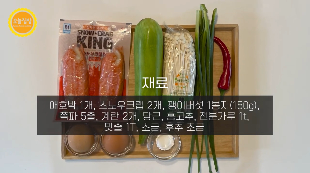 애호박 1개, 스노우크랩 2개, 팽이버섯 1봉지(150g), 쪽파 5줄, 계란 2개,