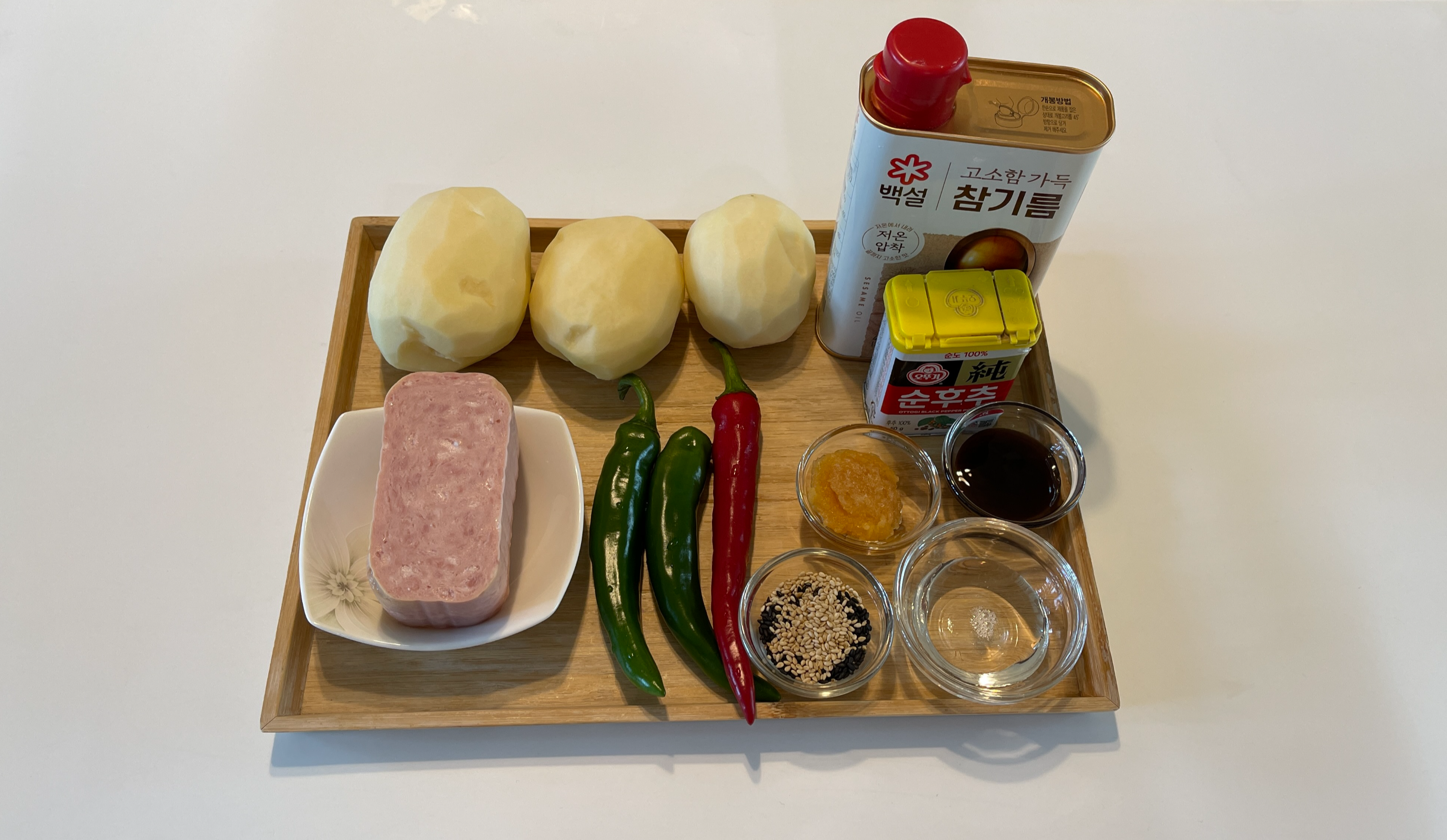 감자 3개(500g), 햄 200g, 청홍고추