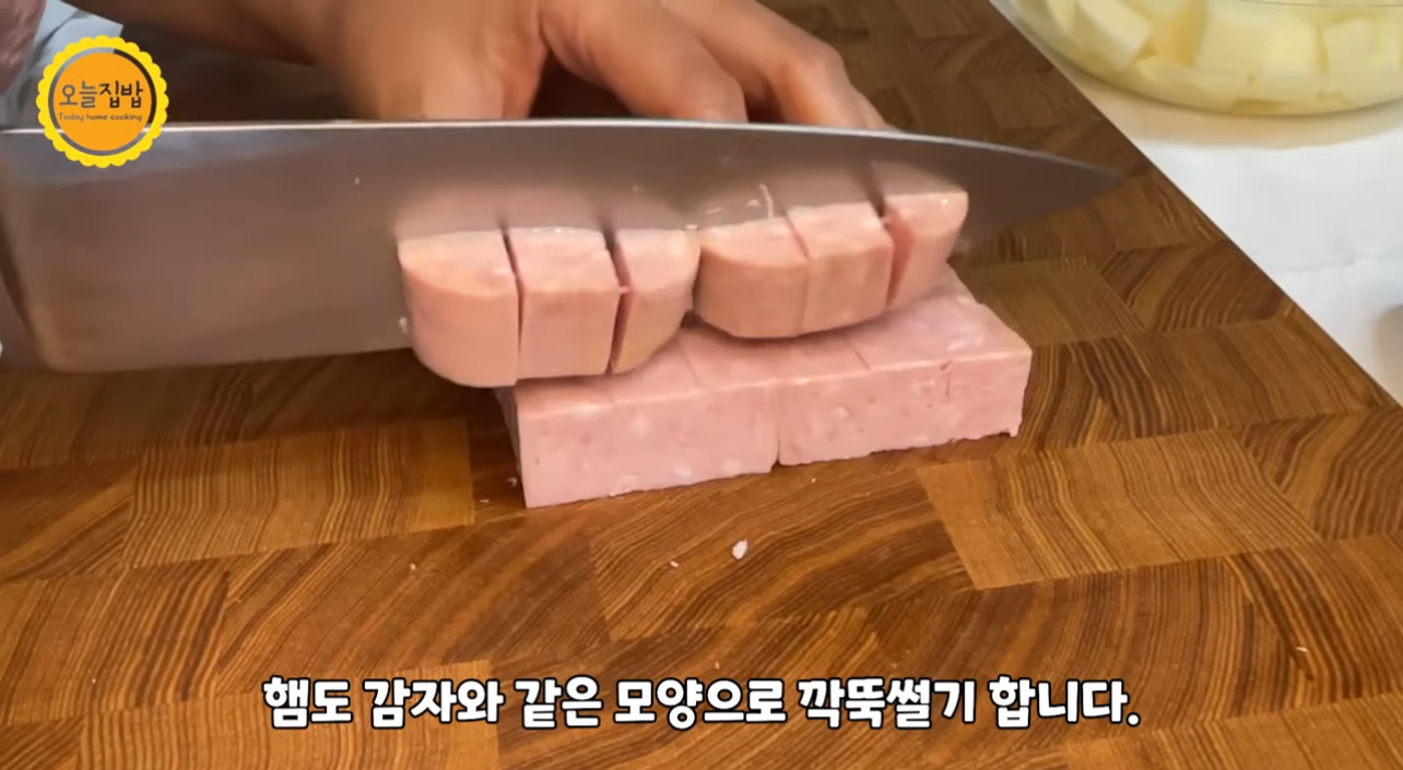 햄 썰기 : 햄도 감자와 같은 모양으로 깍뚝썰기 해요