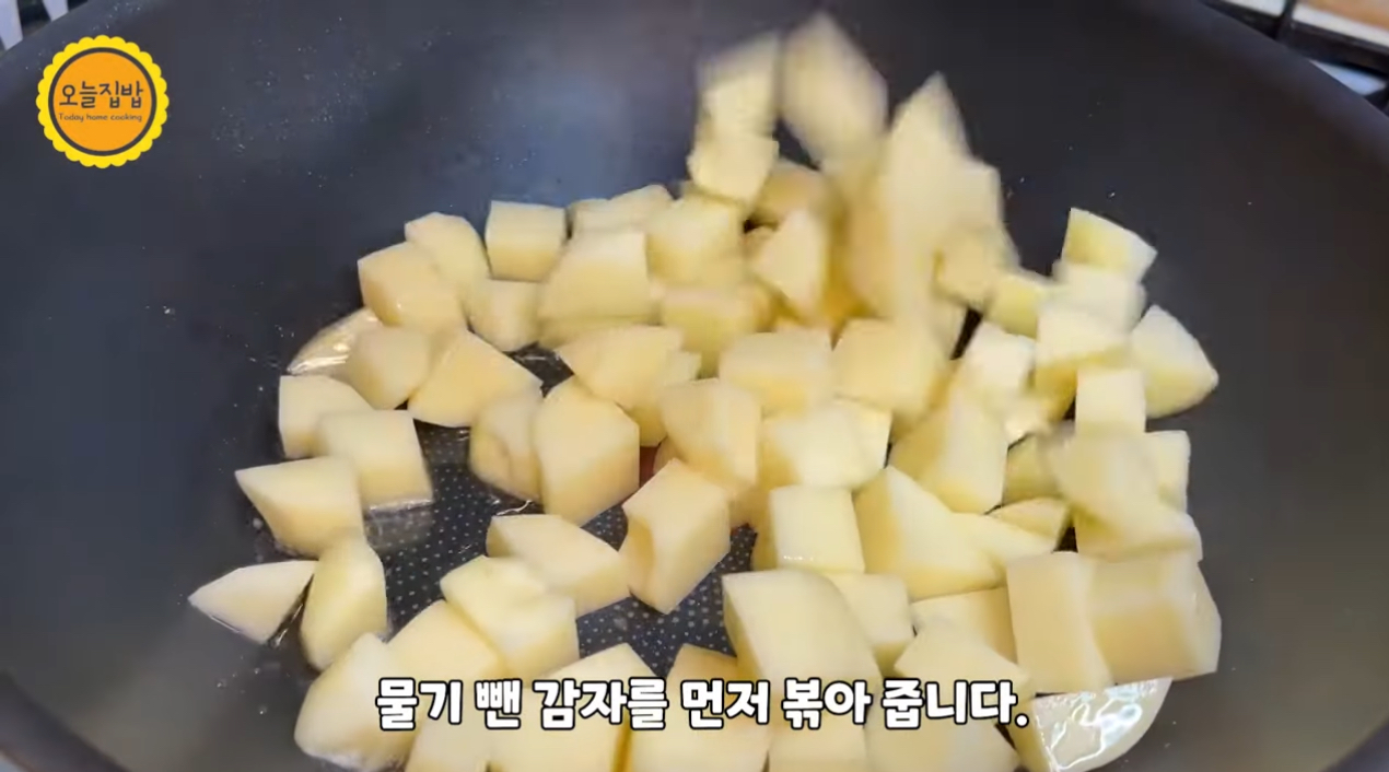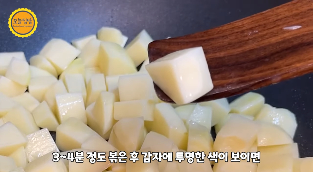 2. 감자 볶기 : 달군 후라이팬에 기름을 넉넉히 두른 후 물기 뺀 감자를 먼저 볶아 주세요