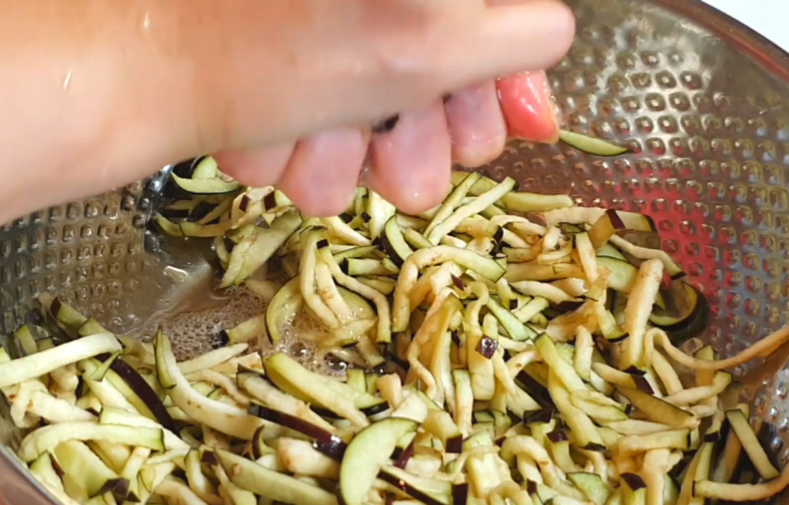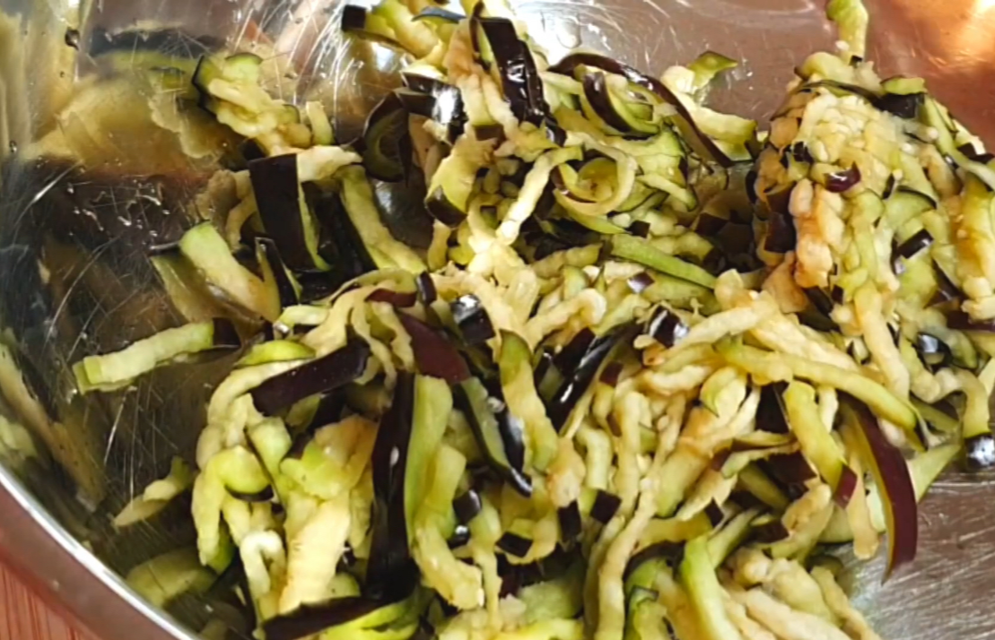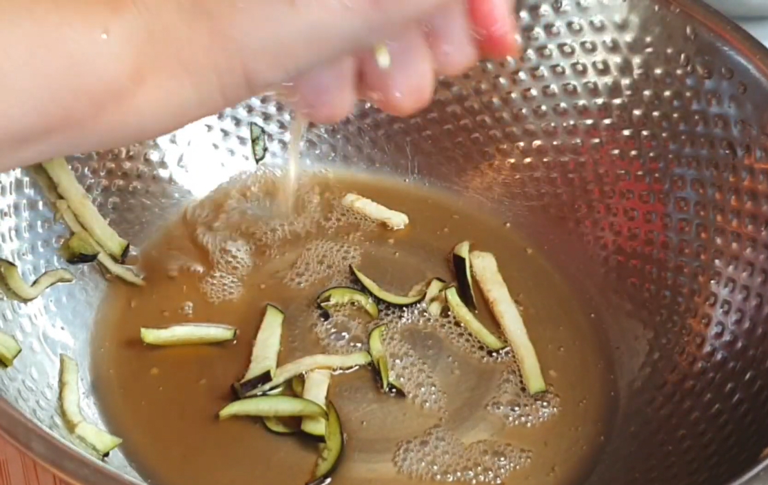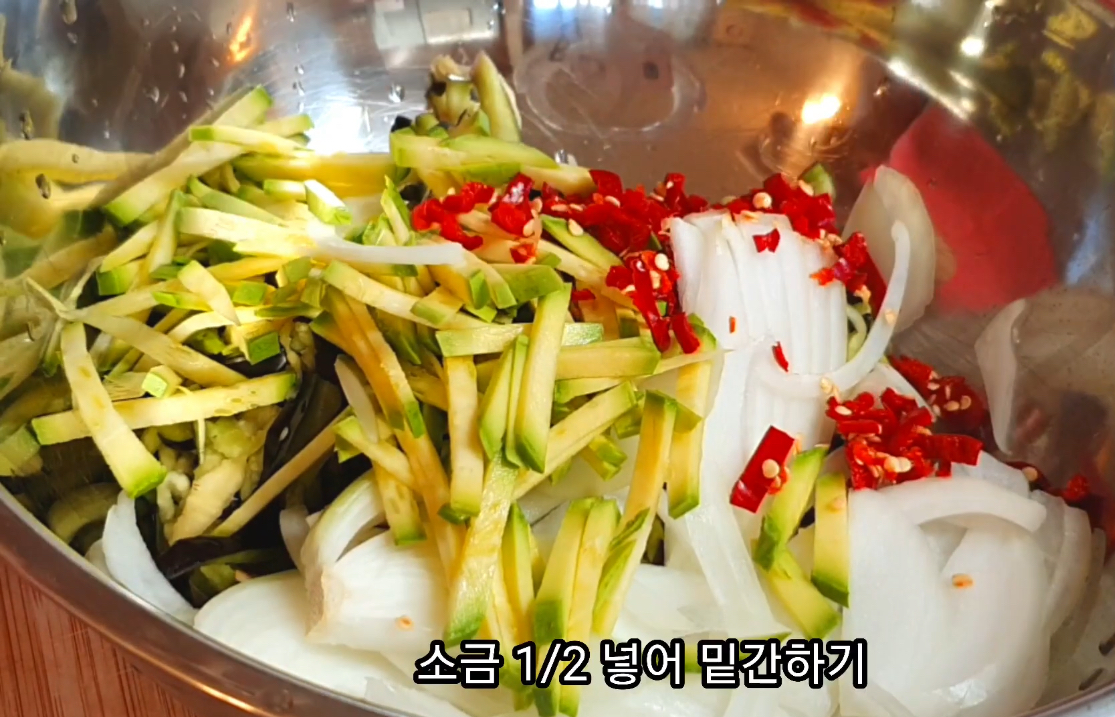 1. 가지 먼저 채썰어 소금 1/2t(가지 1개 기준), 넣고 10~20 분 절여둔다