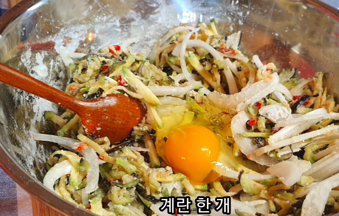 4. 볼에 채썰어 준비한 야채들과 계란 한 개, 부침가루 2T, 튀김가루 2T 넣고 섞어준다