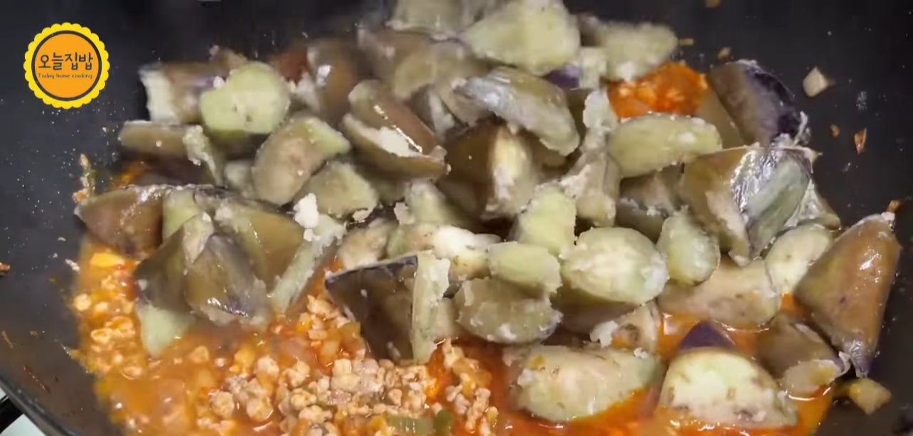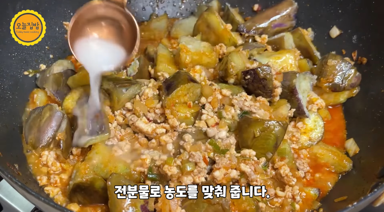 야채 넣어 소스 만들어 가지랑 섞어 전분물로