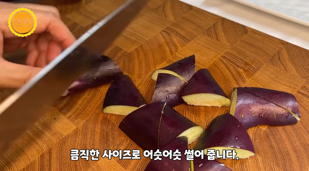 1. 가지는 길게 반잘라 어슷어슷 썰어 주세요