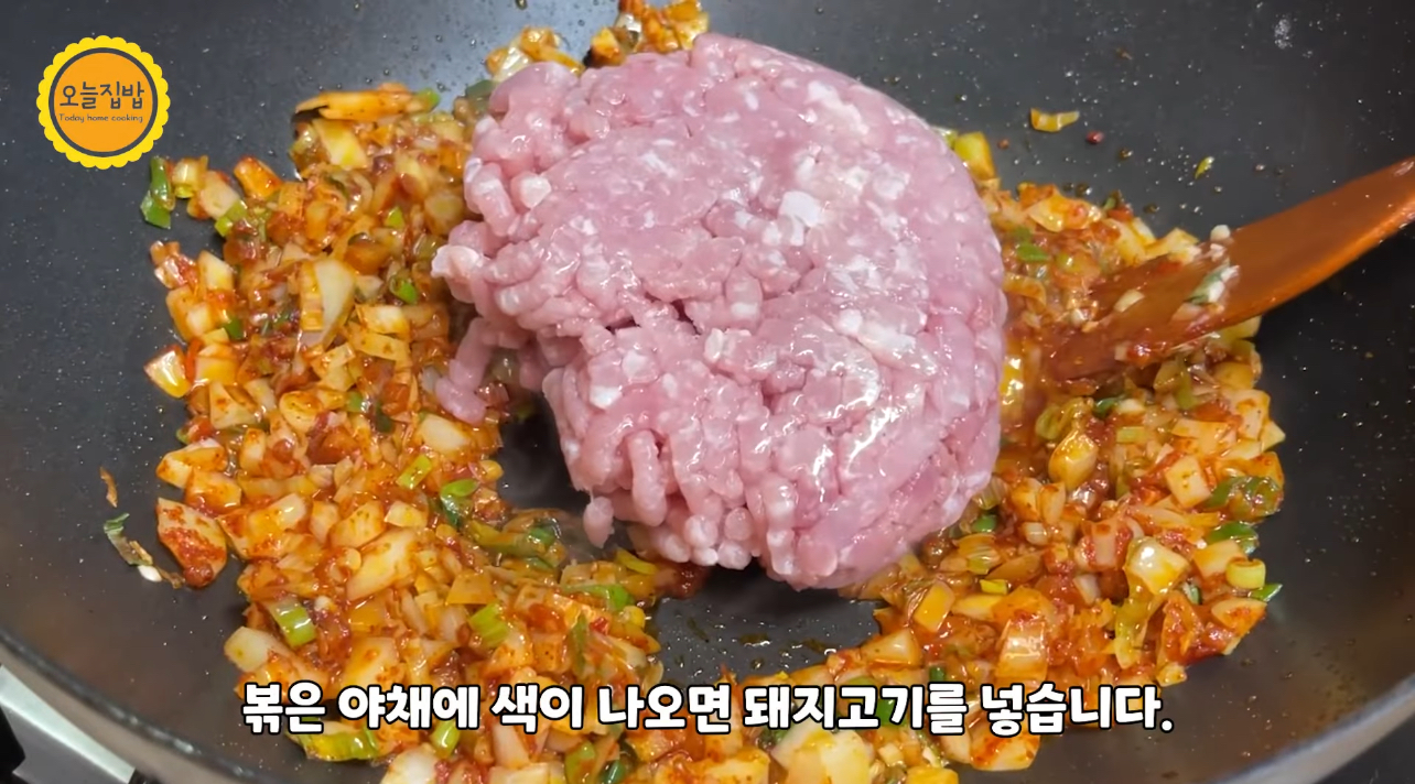 10.어느정도 색이 나오면 돼지고기를 넣어요