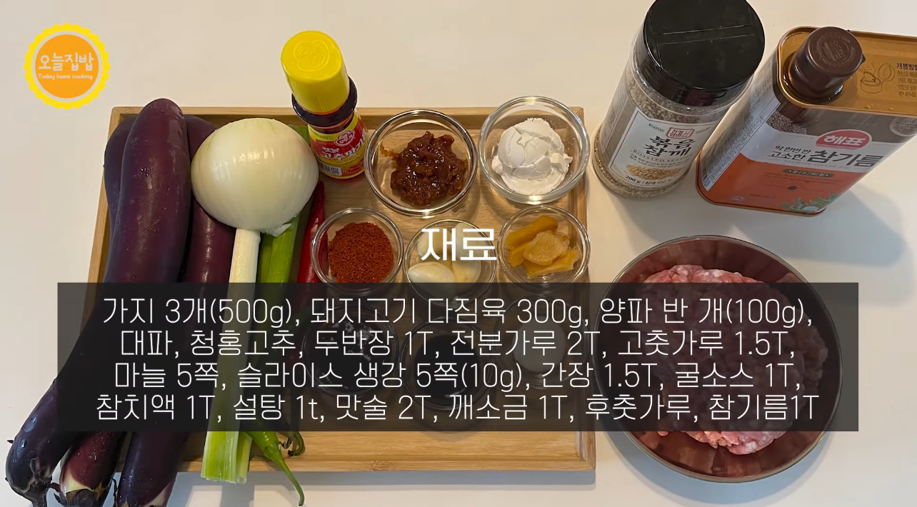 가지 3개(500g), 돼지고기 다짐육 300g, 양파 반개(100g), 대파, 청홍고추, 두반장 1T, 전분가루 2T, 고춧가루 1.5T, 마늘 5쪽, 슬라이스 생강 5쪽(10g) 간장 1.5T, 굴소스 1T, 참치액 1T, 설탕 1t, 맛술 2T, 깨소금 1T, 후추가루 조금, 참기름 1T