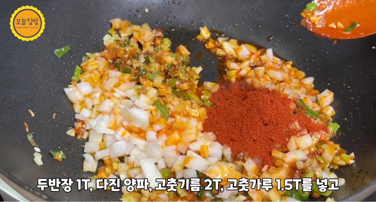 두반장, 다진 양파, 고춧가루 넣고 고추기름 2T, 넣어 색이 배도록 살짝 더 볶아 주세요