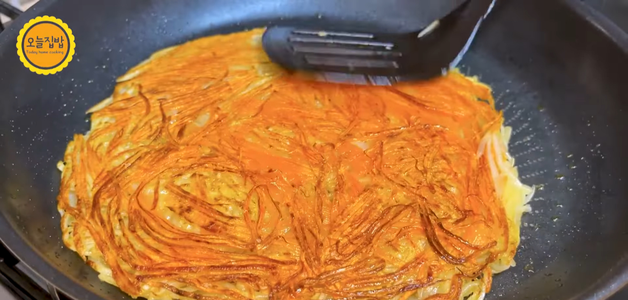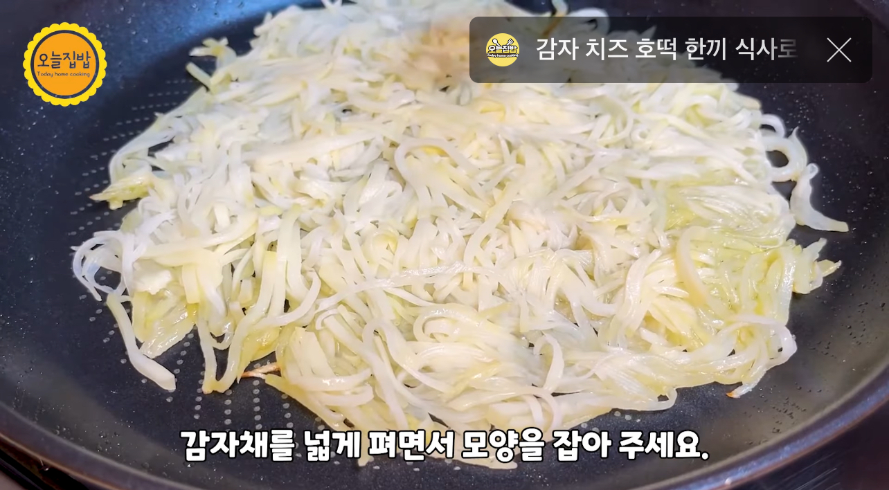 이번엔 기름을 두른 팬에 다시 감자채를 넓게 펴 모양을 잡아 주세요