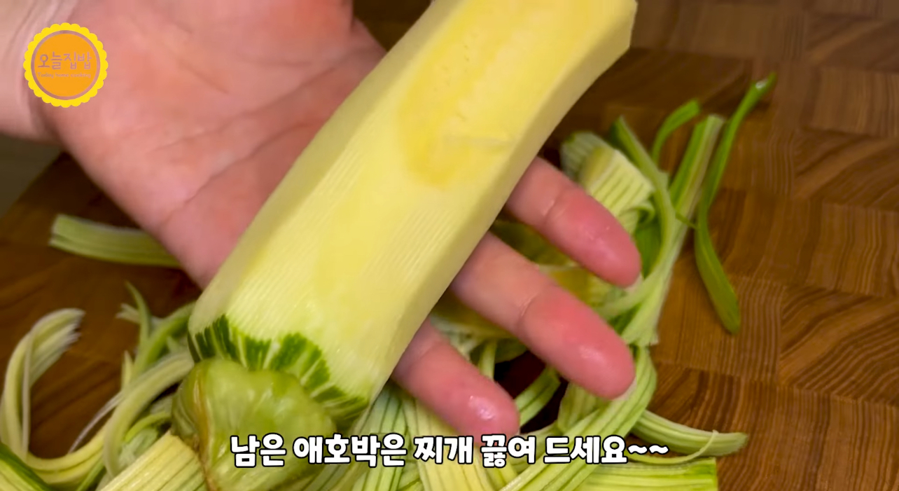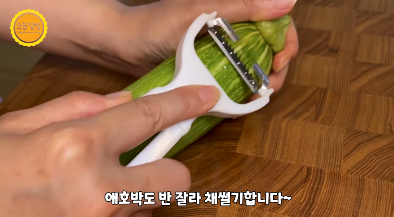 애호박은 색이 진한 겉부분만 채칼로 채썰기 합니다.