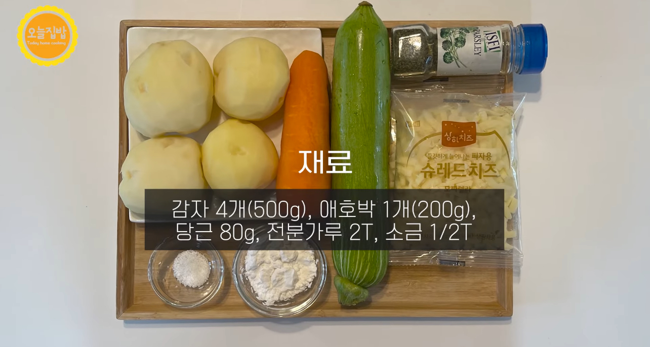 감자 4재(500G), 애호박 1개(200G), 당근 80G, 전분가루2T, 소금 1/2T, 피자치즈,파슬리 조금(선택)