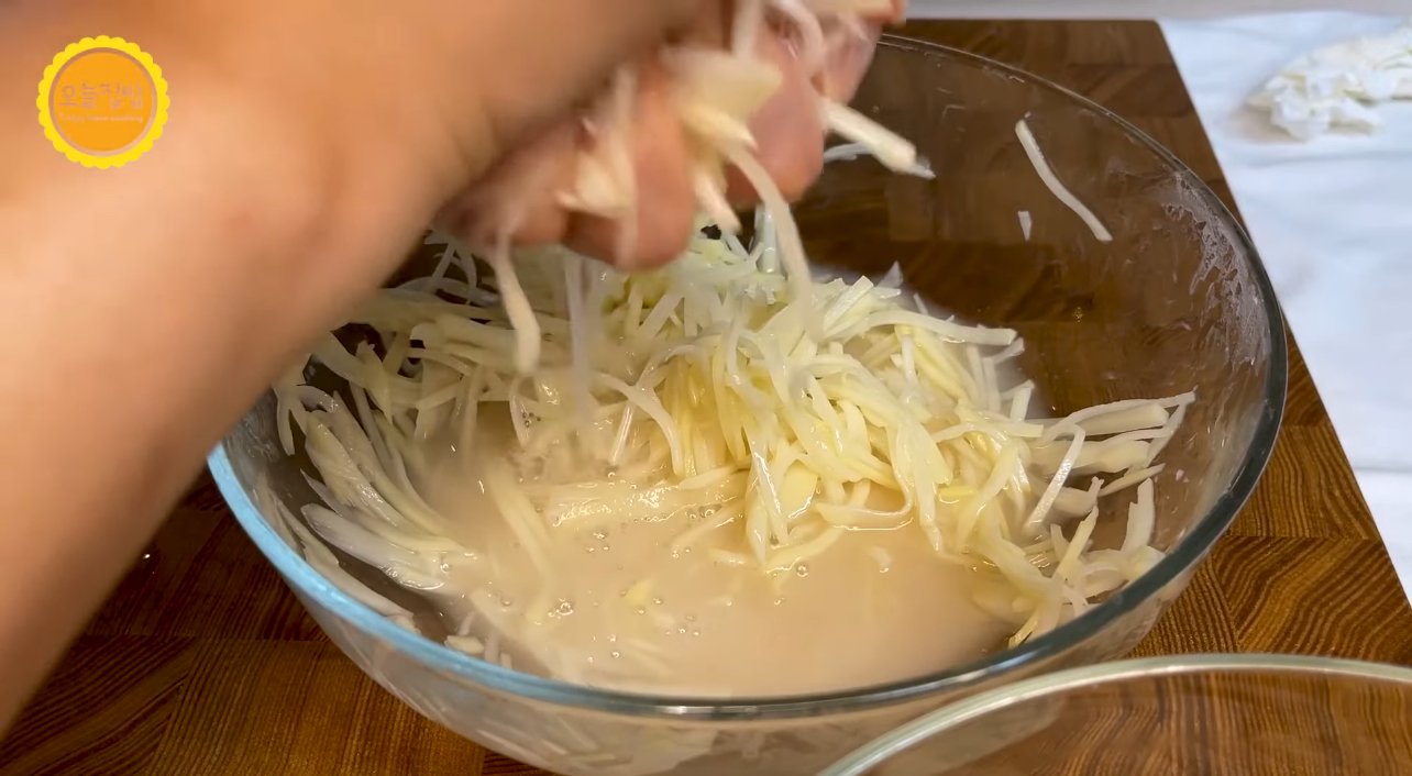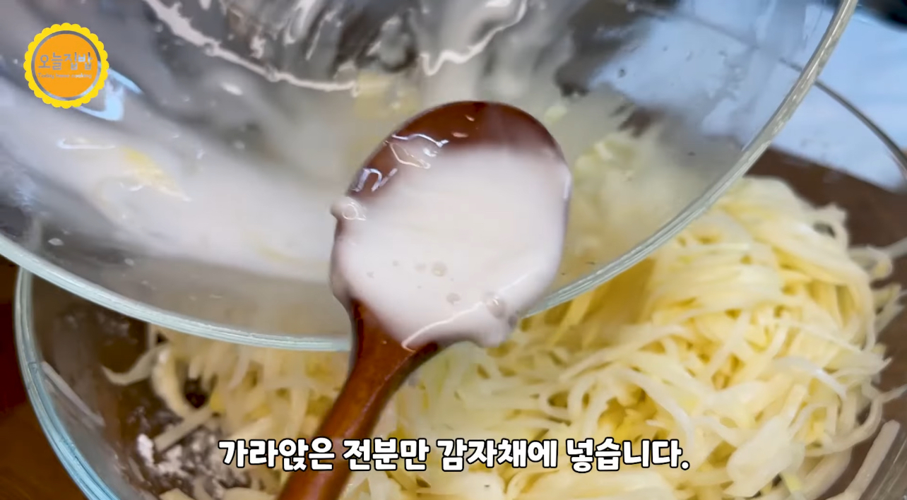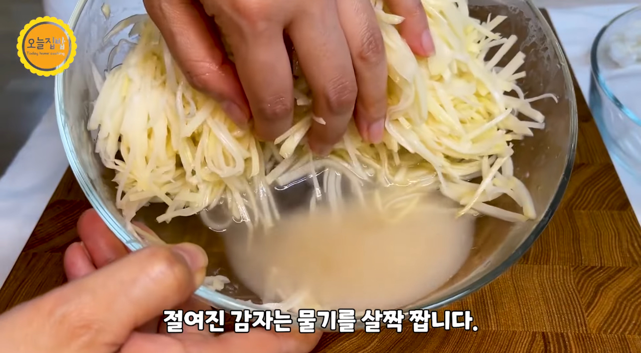 10분 후 절여진 감자에서 생긴 물기는 살짝 짜 냅니다.