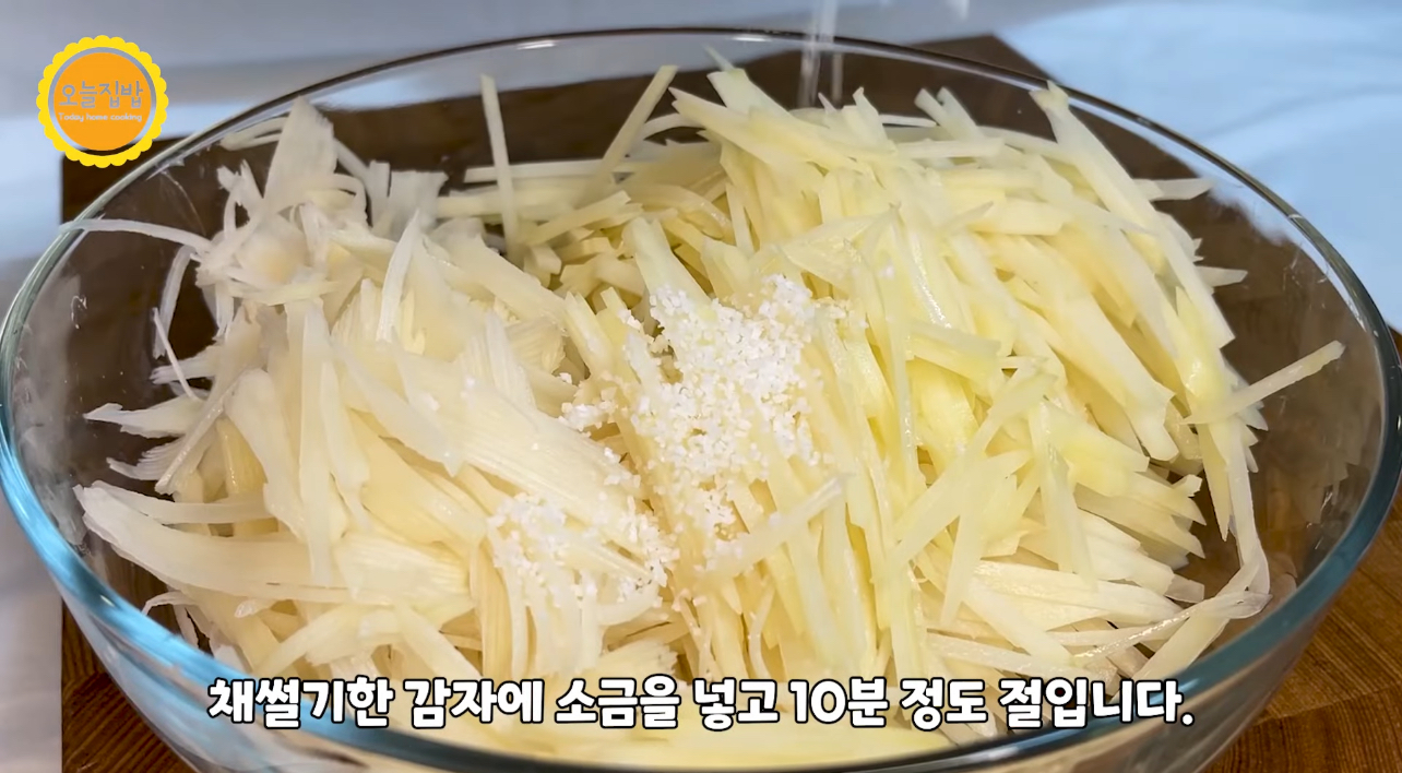 2. 감자 절이기: 채 썰은 감자에 소금 1T 넣고 10분 절이기