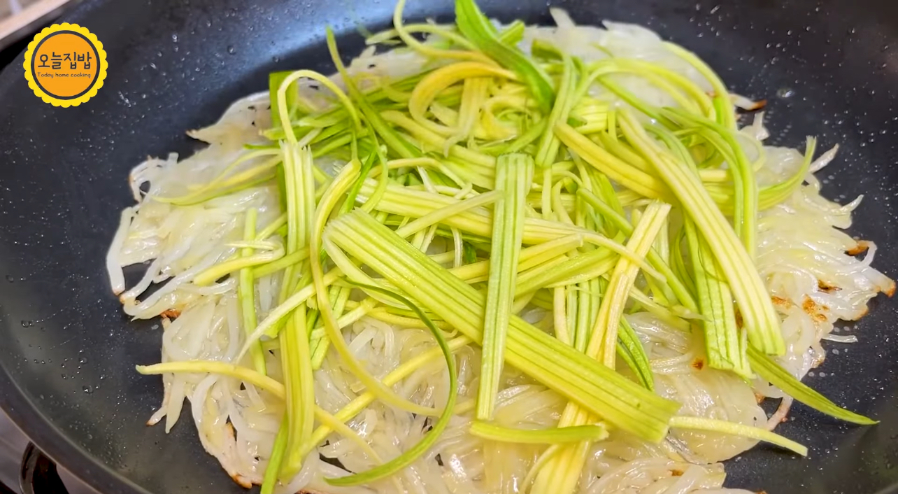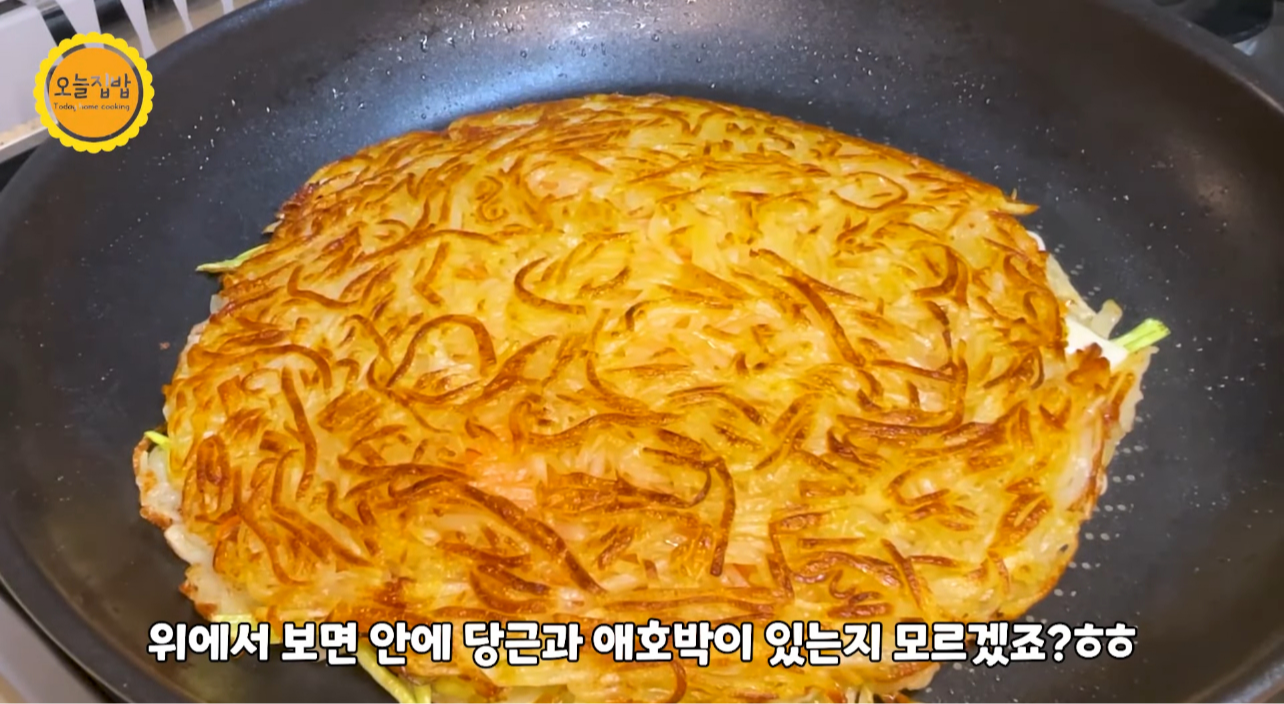 한 면이 익으면 뒤집어 그 위에 채썰어 준비한 애호박채를 올려줍니다.