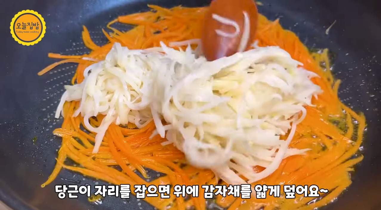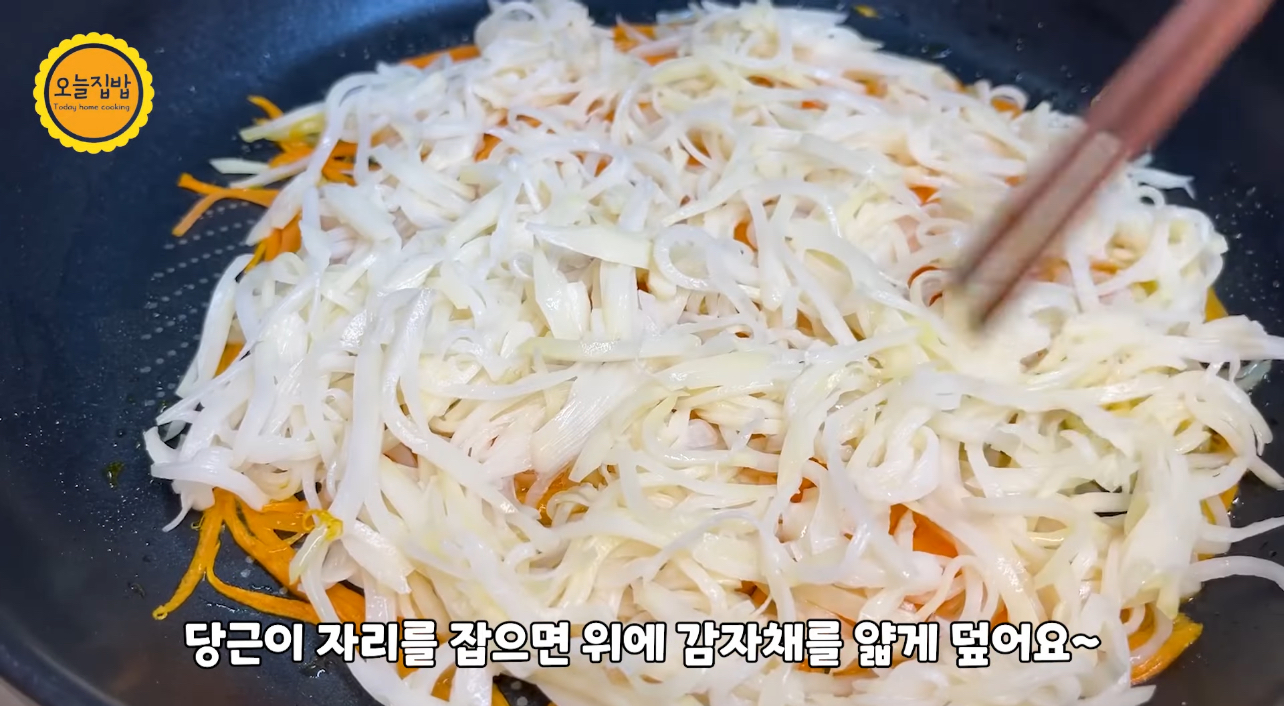 당근이 반 정도 익으면 감자채를 얇게 펴 주세요.