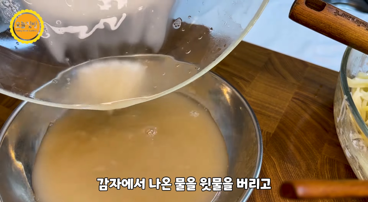 감자에서 나온 윗 물은 버리고 가라앉은 전분만 감자채에 넣어 줍니다.