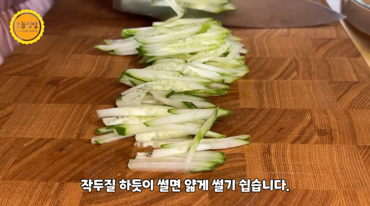 3. 오이는 얇게 채썰기 합니다. 일정한 굵기로 채 썰어야 좋아요