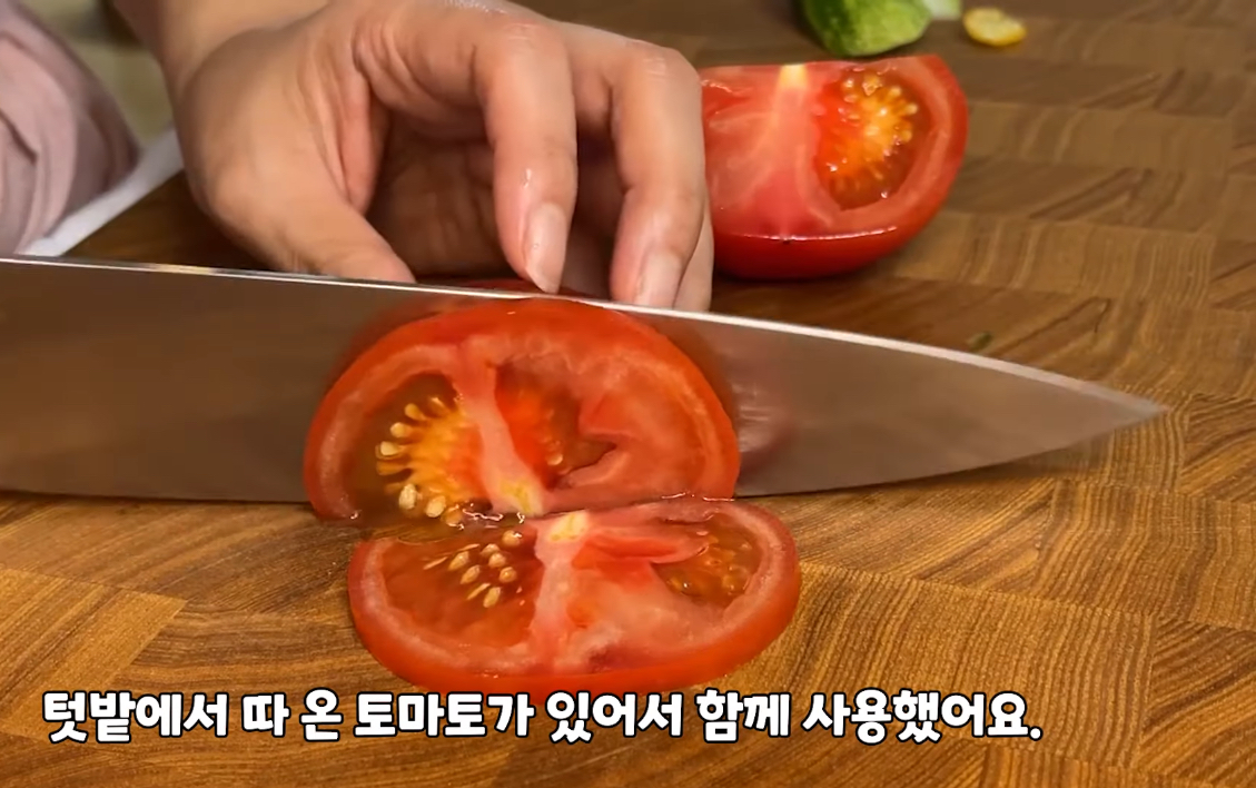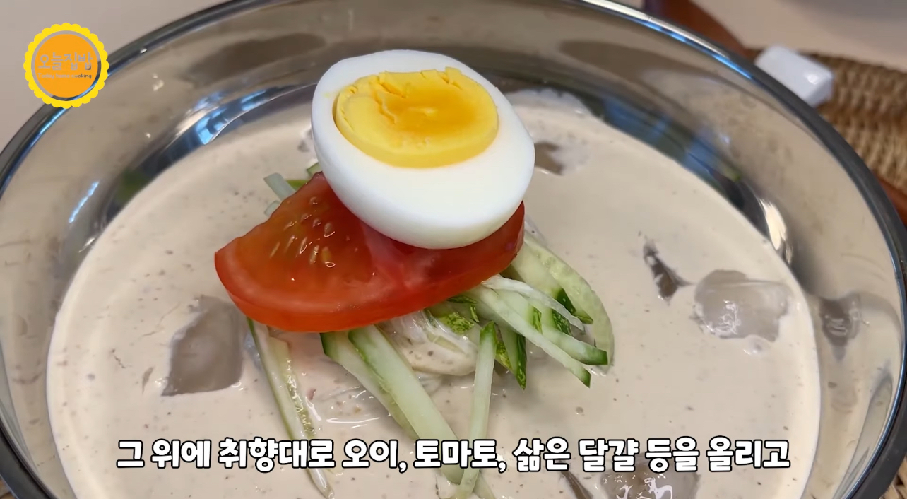 그 위에 취향대로 준비한 채 썬 오이, 토마토, 삶은 달걀 반 개 올리고 통깨 조금 솔솔~ 뿌려주면