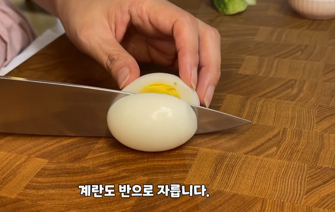 삶은 계란도 반으로 잘라 미리 준비 합니다.