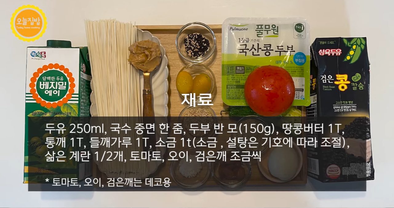 두유 250ml, 국수(중면) 한줌, 두부 반 모(150g), 땅콩버터 1T, 통깨 1T, 들깨가루 1T, 소금 1t(소금, 설탕은 기호에 따라 조절), 삶은 계란 1/2개, 토마토, 오이,검은깨 조금