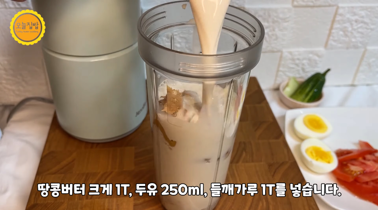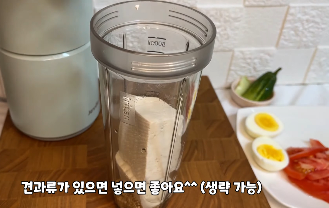 믹서기에 두유250ML, 통깨 1T, 두부 반 모(150g), 땅콩버터 1T, 견과류(땅콩이나 아몬드,호두 등) 있으면 조금 같이 넣어주면 더 고소한 맛이 나서 좋아요... 잣을 넣으면 정말 고소하지만 잣은 너무 비싸서 가성비 다져서 집에 있는 견과류 활용하시면 됩니다.